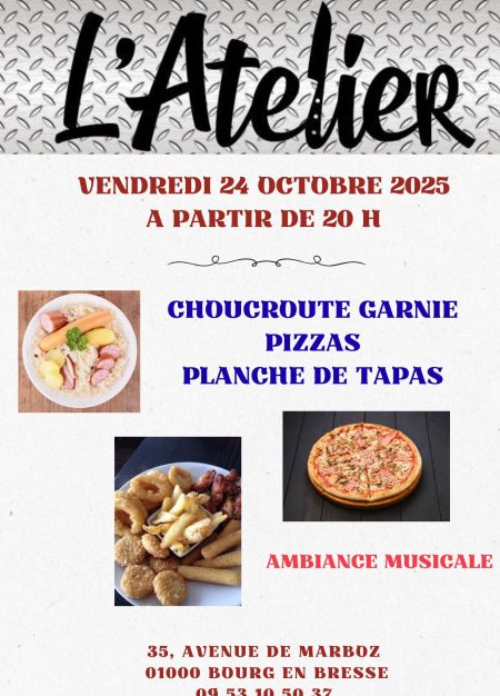 L'Atelier situé dans la zone industrielle de Cénord à Bourg-en-Bresse vous accueille du lundi au vendredi de 8h30 à 15h00 et le vendredi soir à partir de 18h30. L'équipe de l'Atelier est heureuse de vous accueillir au sein du bar – restaurant dans un cadre industriel et vous assure une ambiance chaleureuse.